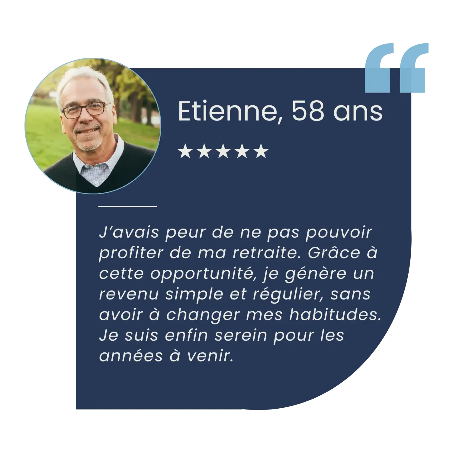 Absolument. Cette opportunité a été pensée pour les personnes de 50 ans et plus qui souhaitent construire un revenu complémentaire stable sans recourir à un emprunt, sans bouleverser leur quotidien.
